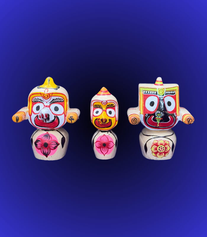 Be the first to review “Hand-Painted Jagannath Balabhadra Subhadra Wooden Idol Set (Floral Base)” Cancel reply