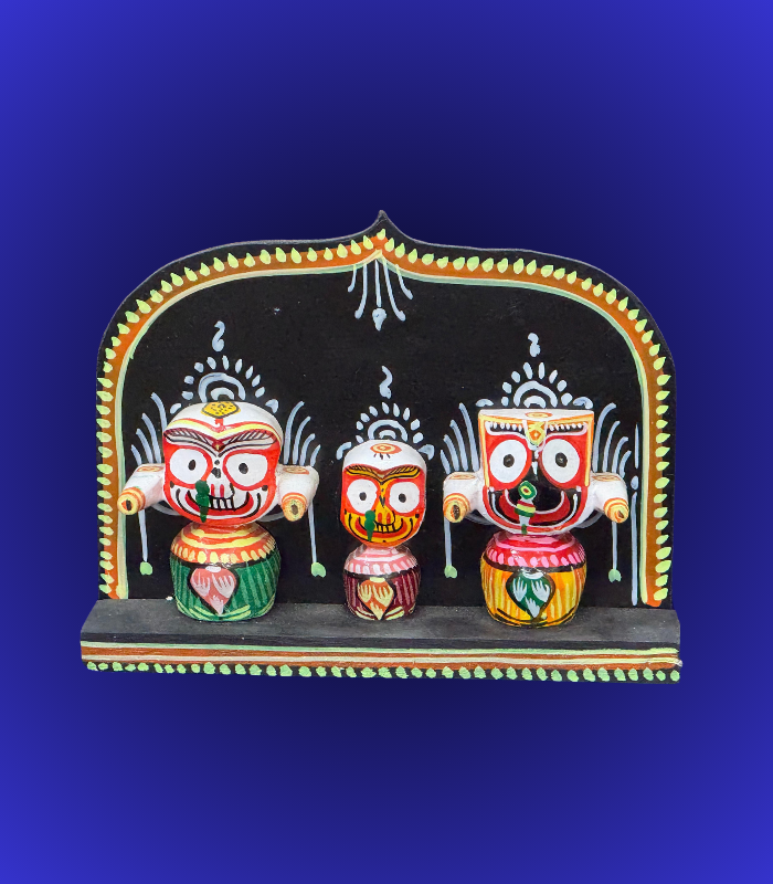 Jagannath Trio Wooden Temple Arch Showpiece – Hand-Painted Backdrop